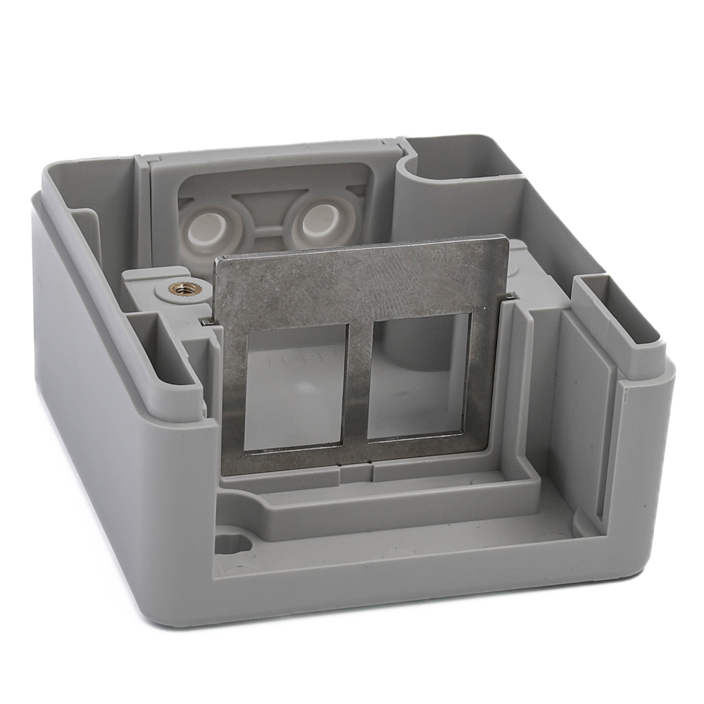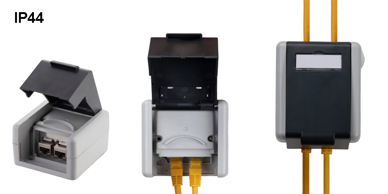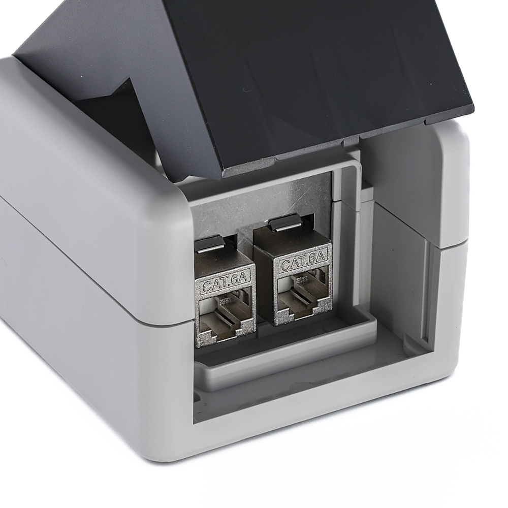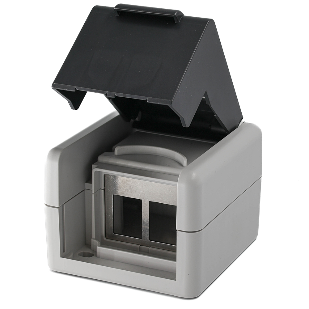 Накладна коробка призначена для встановлення, зокрема, у вологих приміщеннях і на відкритому повітрі. Коробка підходить для розміщення двох модулів KeyStone. Два еластичні ущільнення забезпечують легкий прохід кабелів діаметром від 5,0 до 9,5 міліметрів у гумовій вставці, корпус для поверхневого монтажу гарантує швидку та модульну установку. У підключеному стані відповідає класу захисту IP20, а закритому стані — IP44. Корпус для поверхневого монтажу виготовлений із стійкого до ультрафіолетового випромінювання та ударостійкого пластику. Велике віконце для маркування дозволяє легко маркувати.