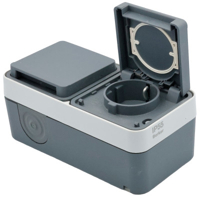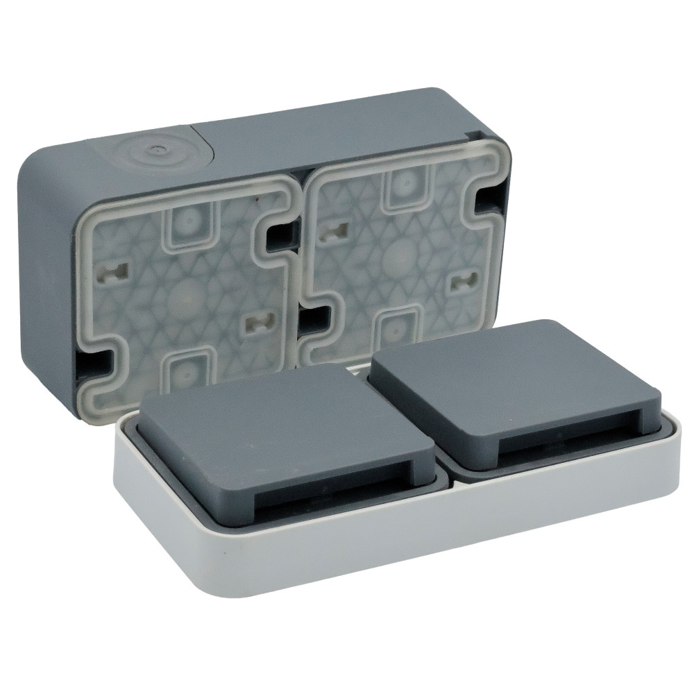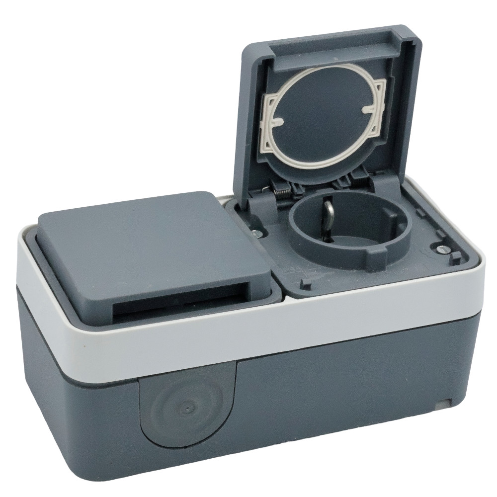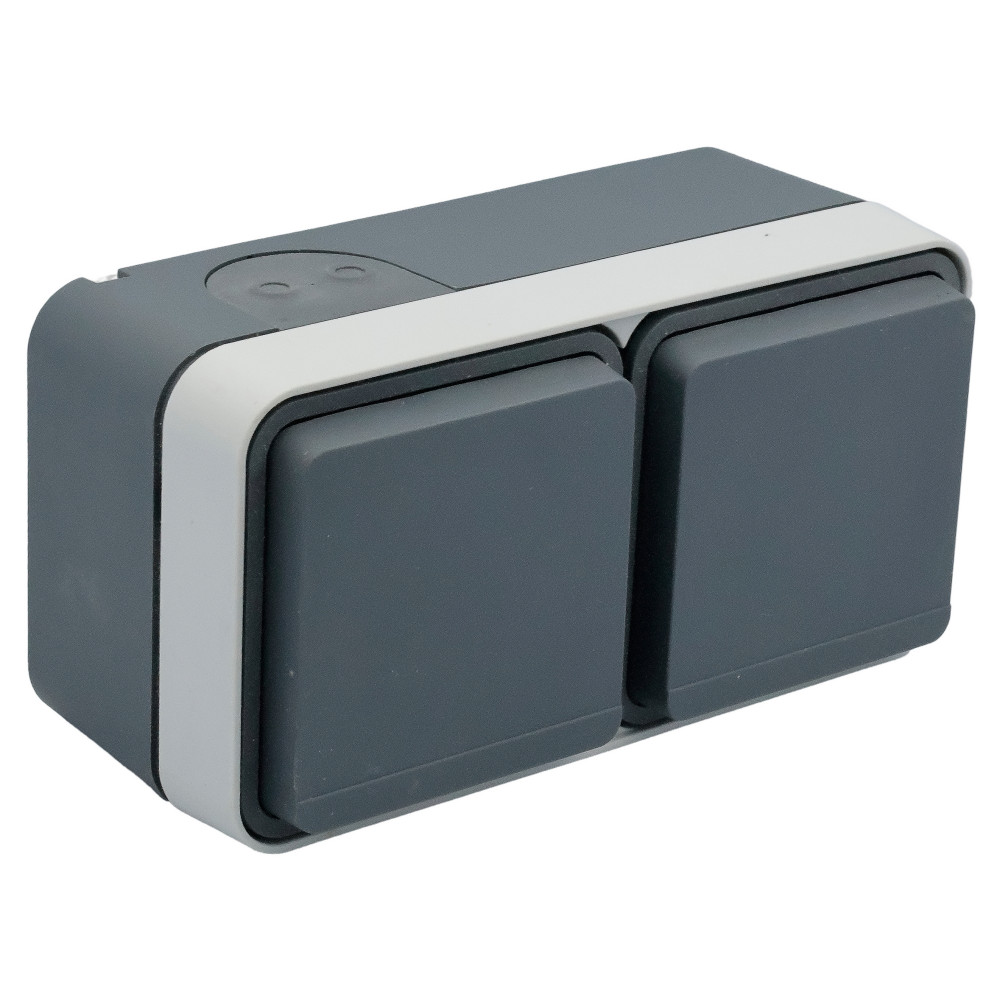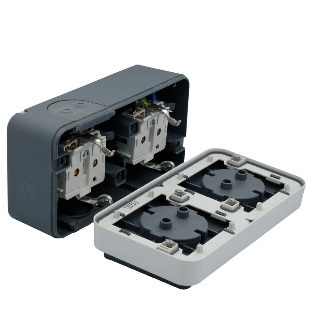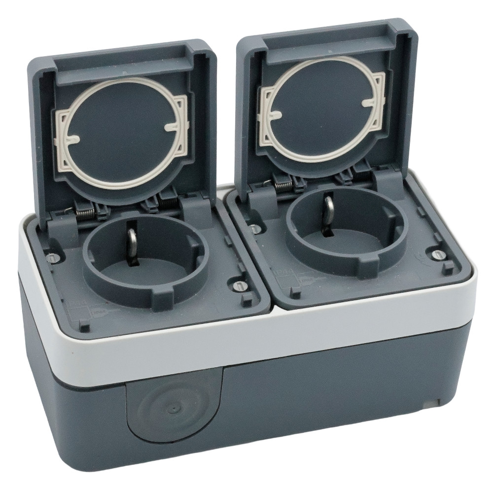 SCHUKO 2-gang horizontal socket with hinged cover, for surface mounting. Cover springs are made of stainless steel, quick-release pins are made of ZAMAK. With one entry for two cables and one entry for a cable or pipe. The inserts are connected by a wire.
