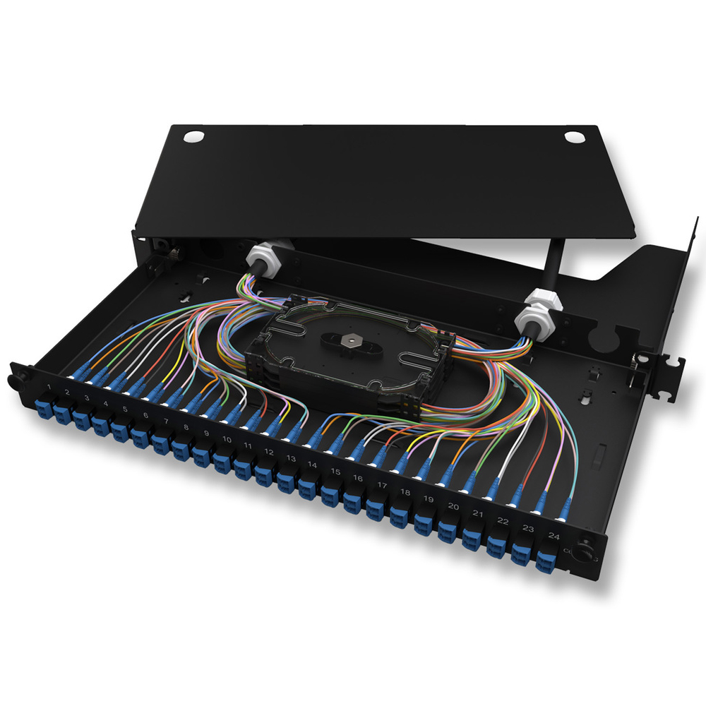 LANscape® Fiber Housing loaded with LC Duplex UPC shuttered adapters and pigtails, 48 Fibers, 1U, SMF-28® Ultra fiber, universal splice pack, protectors not included, black