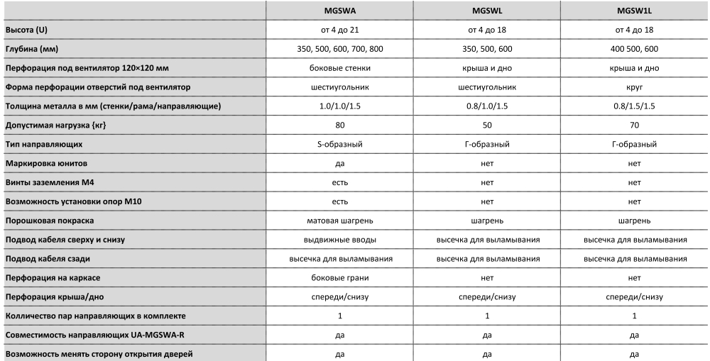 Отличия 19" настенных серверных шкафов MGSWA, MGSWL, MGSW1L