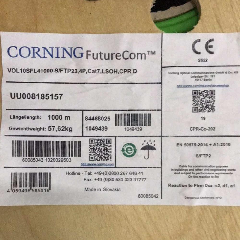 Кабель с экраном Corning 7 S/FTP поддерживает подключение к сети Ethernet на скорости 10 Гбит/с, проходит тестирования прибором Fluke по всем параметрам и соответствует стандартам ISO 11801 Class F и ANSI/TIA-568.2-D Category 7.