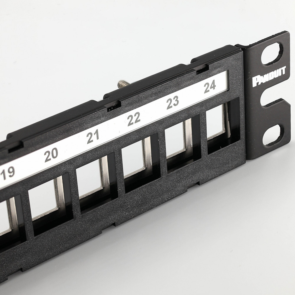 Модульная патч-панель 19″ для установки 24 KeyStone. Для неиспользуемых портов под модули предусмотрены черные пластиковые заглушки с креплением формата KeyStone (опционально). На лицевой части предусмотрено место для маркировки портов. Конструкция и встроенные функции обеспечивают надёжное подключение.