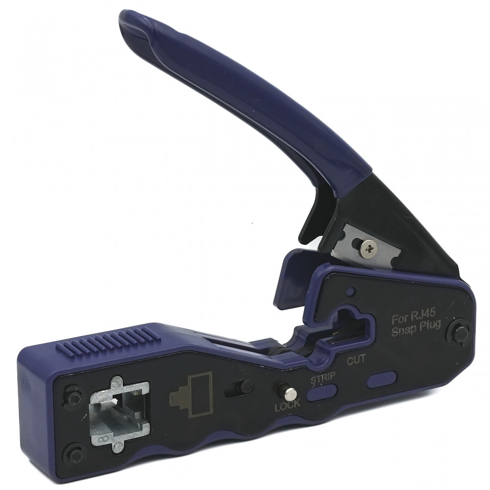 Ручной инструмент для обжимания UTP/STP проходных коннекторов 8P8C/RJ45. Инструмент может быть использован и для обжима и стандартных не сквозных разъёмов RJ45. В корпус инструмента встроен резак для обрезки кабеля, и "стриппер" для сняnия изоляции. В конструкции предусмотрено наличие блокировки, для удобного хранения и транспортировки. Корпус выполнен из стали и пластика.